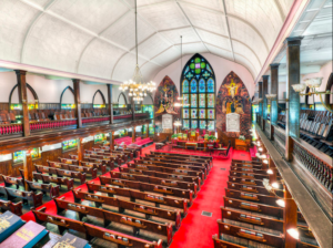 The current church building on Calhoun Street is the third house of worship built and occupied by the Emanuel AME congregation since the church was founded in 1818; the first was located at the corner of Hanover and Reid Streets, and the second and third on the present Calhoun Street site. The first church building erected by the congregation on Calhoun Street was built shortly after the Civil War and destroyed in the earthquake of 1886. At this time, the congregation hired Charleston’s preeminent postbellum architect, John Henry Devereux, to design the current three-story brick church building with a prominent four-story steeple.[4] Typical of the Gothic Revival style, the church building features a steeply pitched roof, arched openings, buttresses, and intricate brick detailing. Construction began in 1891, but before the building was complete, it was significantly damaged by a cyclone in 1893, delaying its dedication until 1901. The building was extensively renovated in 1949-1951, at which time the masonry exterior was stuccoed and painted white, the front double stair was added, and several window openings on the Calhoun Street façade were infilled. Notably, the sanctuary largely retains its original floorplan and many interior features, a rarity among other Victorian era churches in the city.[5]