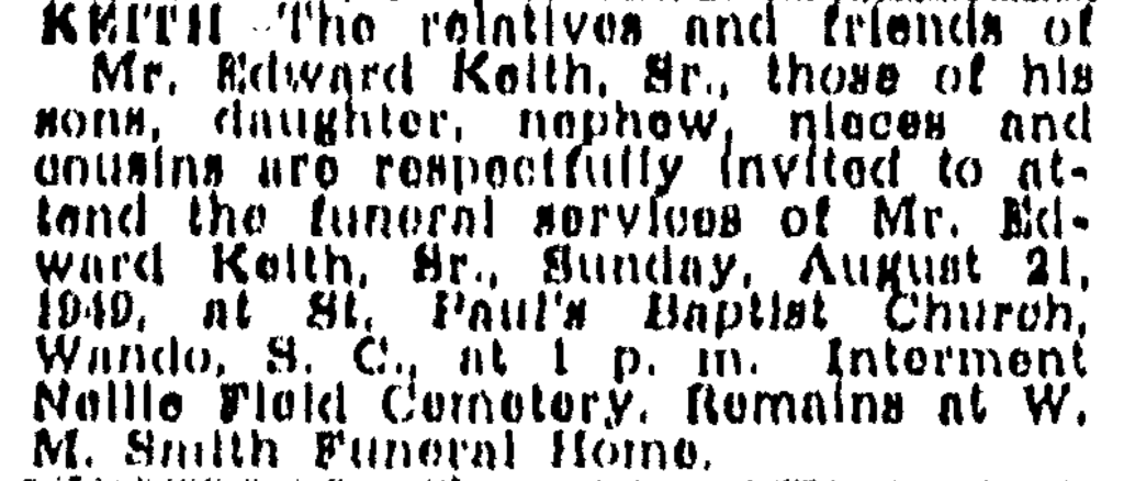 [14] Division of Vital Statistics, State Board of Health, State of South Carolina, “South Carolina, U.S., Death Records, 1821-1969” (Ancestry.com, August 17, 1949), South Carolina death records, South Carolina Department of Archives and History, accessed June 2, 2021; “Rebecca Keith Obituary,” Evening Post (Charleston, South Carolina, December 30, 1944).
