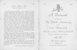 The Owls’ Whist Club was established in 1914 as a fraternal organization for African American businessmen to play cards and discuss social issues at monthly meetings. According to former Club member and community leader Arthur Clement Jr. (1908-1985), the significance of the Club’s name was two-fold: “Owl” referred to members’ affinity for late-evening gatherings, while “Whist,” a popular card game of the time, indicated the Club’s recreational nature.[1] In addition to Whist, members often played other games, including poker.
