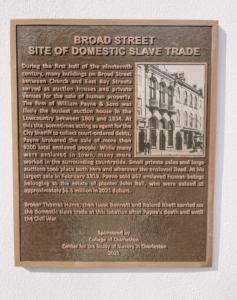 Interpretation of this site, furthered by the installation of a historic marker in 2021, allows for an expanded view of the presence of the slave trade in Charleston beyond traditionally-accepted locations. Director of the College of Charleston’s Center for the Study of Slavery in Charleston, Dr. Bernard Powers, explains: “This research is further compelling evidence that we are still daily learning how and the extent to which pre-Civil War Charleston was a city so organically and thoroughly entwined with slavery.”[12]