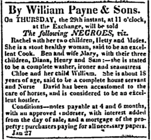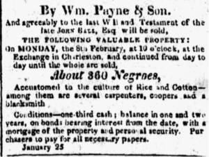 The research on the domestic slave trade of Charleston is an ongoing project of Margaret Seidler, 4th great-granddaughter of William Payne, and the College of Charleston’s Center for the Study of Slavery. Further investigation of historical newspapers, tax records, and business transactions will continue to contribute to modern understanding of the lived experiences of enslaved people in Charleston, and the role of institutions like the auction house of William Payne & Sons and the many other nearby auction houses.