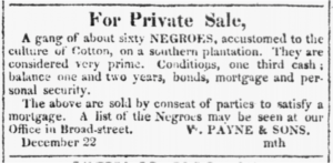 [8] Butler, Nic. “Street Auctions and Slave Marts in Antebellum Charleston.” Charleston Time Machine.