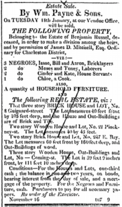 In Charleston, enslaved people were imported, bought, and sold at high-profile waterfront locations, such as the Exchange and Custom House at East Bay and Broad Streets and Gadsden’s Wharf further north on the banks of Cooper River. During the colonial era, the power to sell goods by auction was concentrated in one official, a Vendue Master, who was appointed by the governor.[4] The Vendue Master and appointed deputies were responsible for handling all sales by vendue (auction) in Charleston.[5] After the legal authority to conduct auctions in Charleston was decentralized in 1779, the government began to issue licenses to auctioneers, leading to the rise of a new class of businessmen who specialized in marketing, selling, and transporting of enslaved people on behalf of owners.[6] These agents were often called brokers, auctioneers, vendue masters, or traders, and advertised their auctions in local newspapers.[7] Rather than receiving a salary, auctioneers would receive a percentage of all transactions, and fees for incidental charges related to housing, feeding, and clothing the enslaved people they sold.[8] Many auctioneers secured office spaces near key commercial locations. William Payne & Sons, for instance, was located one block to the west of the Exchange Building on Broad Street.[9] The business also had a smaller vendue office at the northeast corner of East Bay and Gillon Streets for large public auctions.